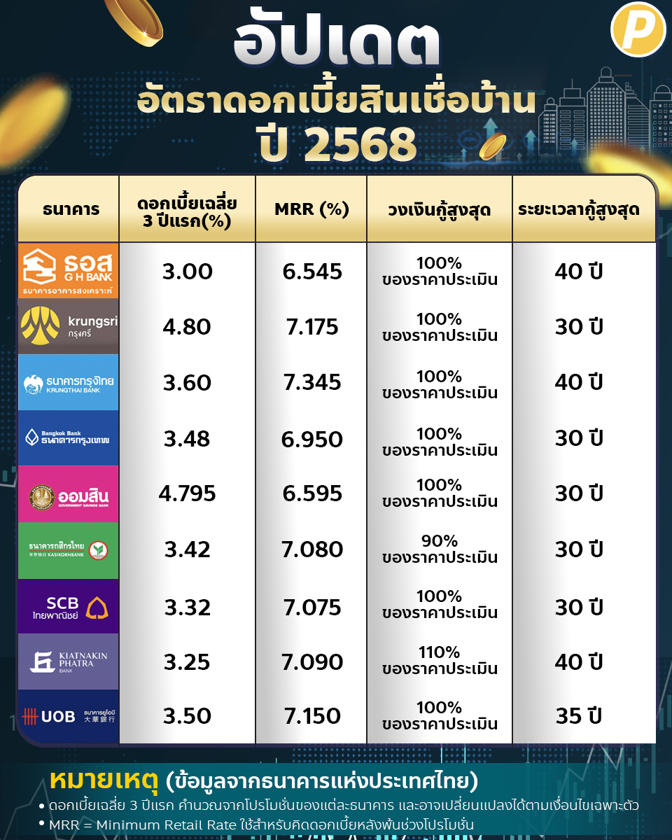 ใครมีแผนซื้อบ้านปีนี้ รีบเช็กด่วน! ตารางเดียว รู้ครบทั้งดอกเบี้ย วงเงินกู้ และระยะเวลาผ่อน จะบ้านเดี่ยว คอนโด หรือทาวน์โฮม วางแผนให้ชัวร์ บ้านในฝันจะได้ไม่หลุดมือ ✨ 📝 หมายเหตุ: อัตราดอกเบี้ยและเงื่อน